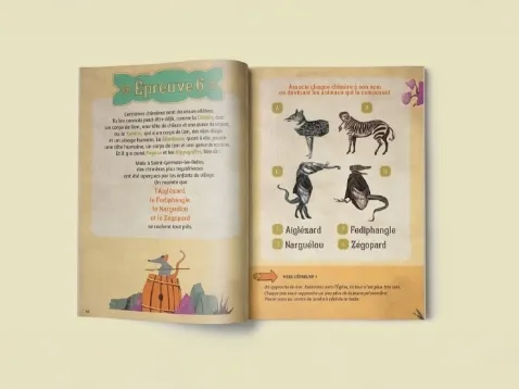 Nous avons imaginé une version poétique et enfantine de la légende de la Belle… délivrée par une chimère fantastique. Tout au long du parcours, les enfants récoltent des stickers en résolvant des énigmes d’observation et de logique. Leur mission : reconstituer la chimère en associant les bonnes parties de son corps.